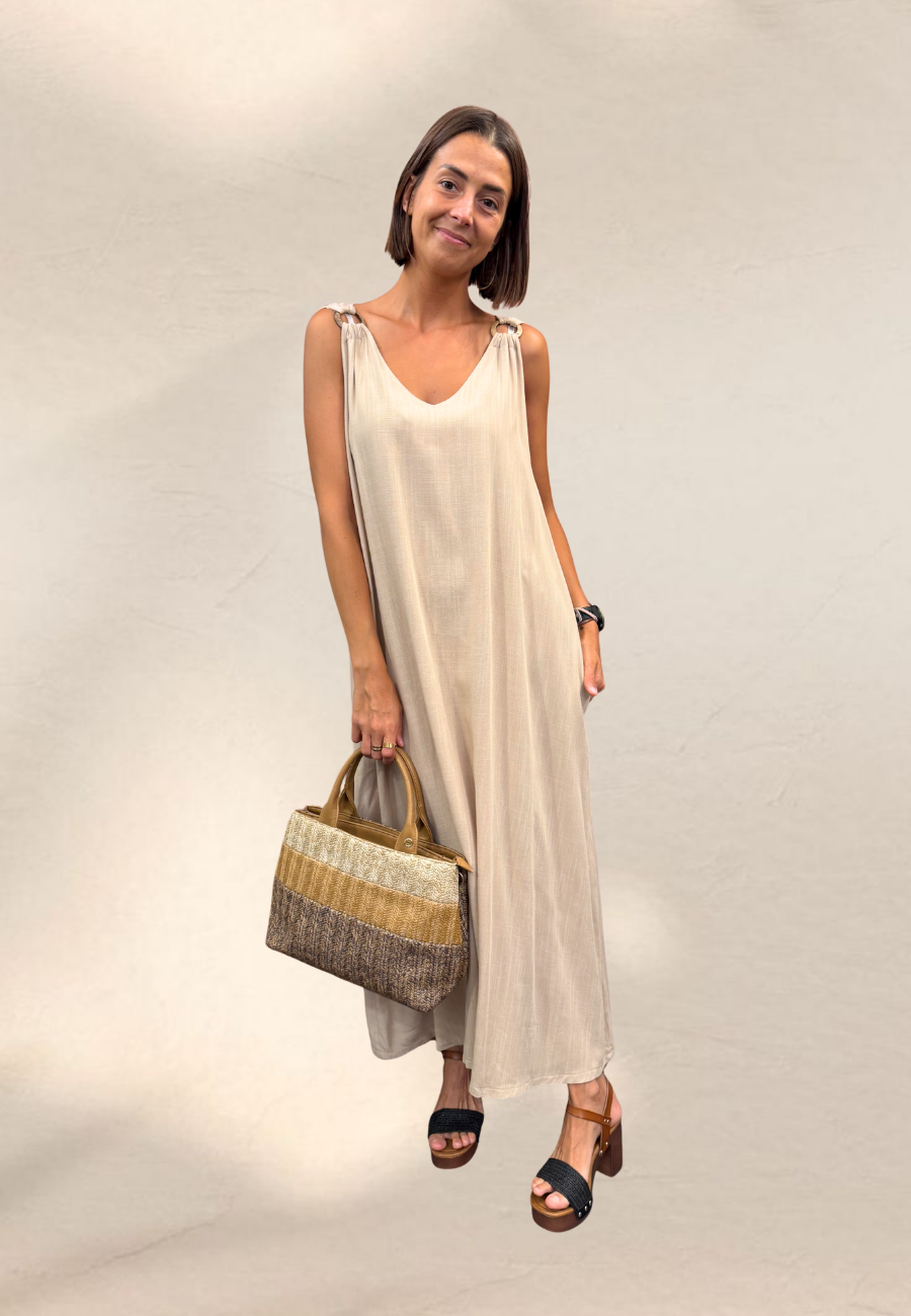 Abito lungo con scollo a V morbido che scende svasato, con dettaglio ad anello sulle bretelle.