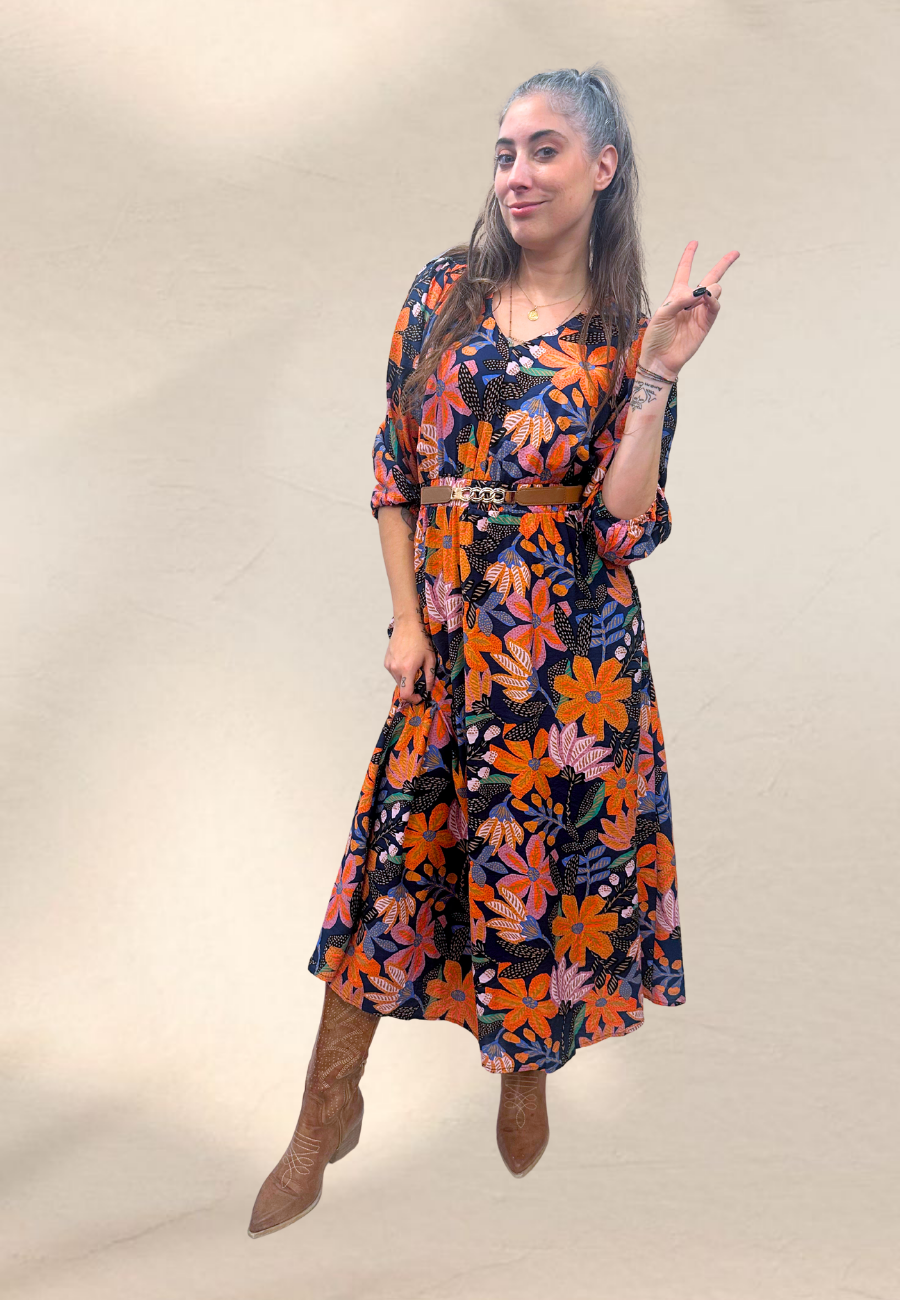 Abito midi dal tessuto fluido, perfetto per l'inizio autunno, manica a 3/4 con polsino arricciato, scollo a V ed elastico in vita quindi se hai una Body Shape a pera diciamo che questo abito fa davvero al caso tuo!!!