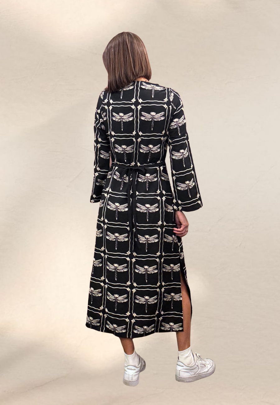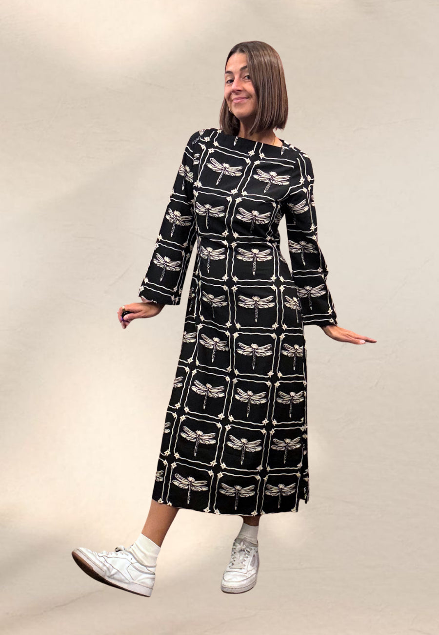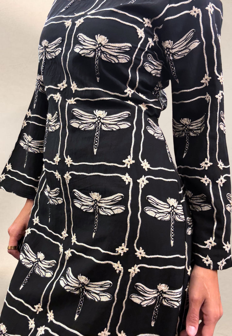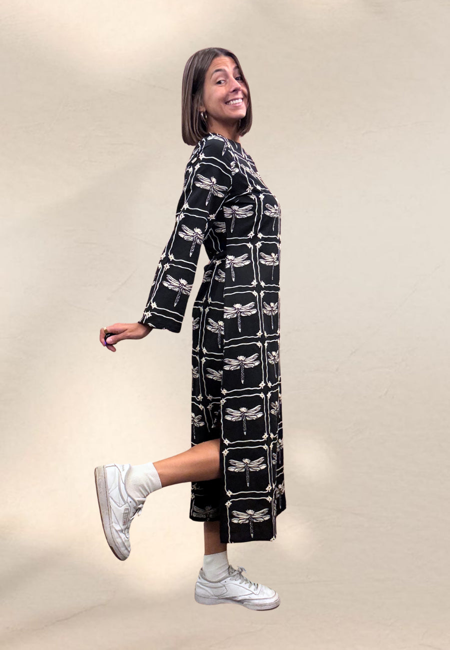 Anche questa Abito potrebbe rientrare nei top 5 della stagione AI 25/26, le libellule sono ricamate, questo dettaglio lo rende ancora più particolare. Taglio dritto con laccetto per cinturina in vita. Collo quadrato.