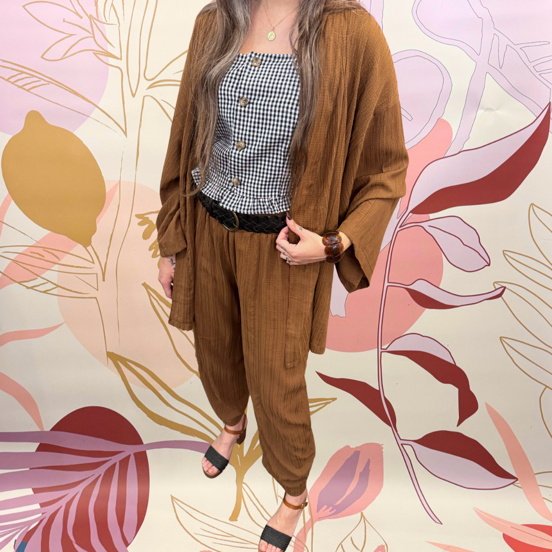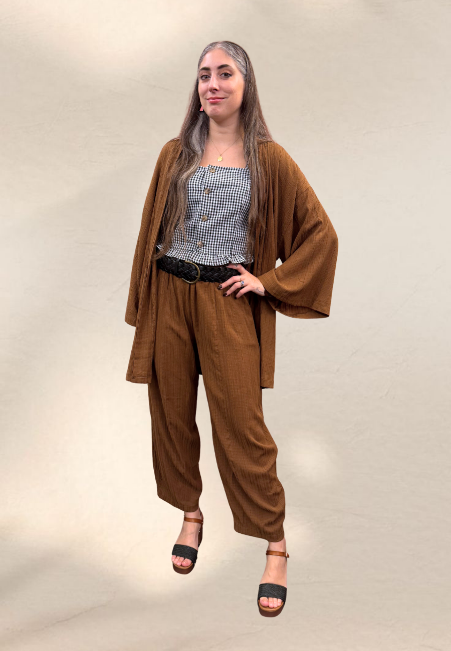 Completo Kimono e Pantalone dal tessuto morbido e fluido, il Kimono ha la spalla scesa e il panta ha l'elastico in vita e le tasche. Molto elegante portato assieme e poi puoi giocare con la tua fantasia facendo un sacco di abbinamenti o perchè no spezzandolo.