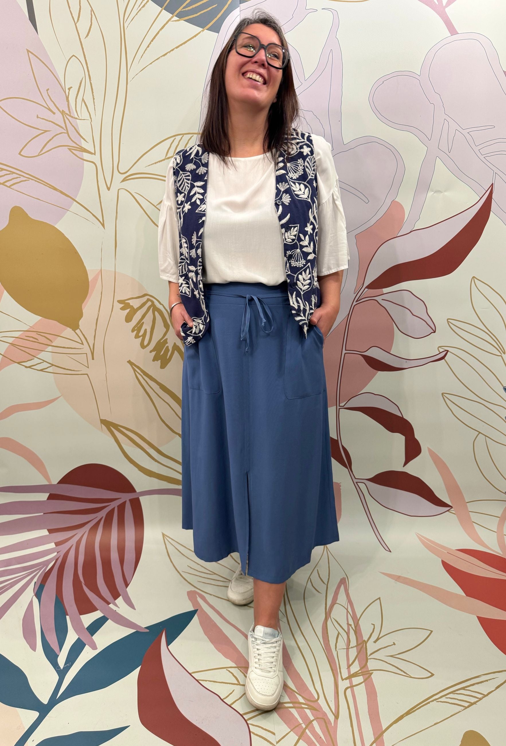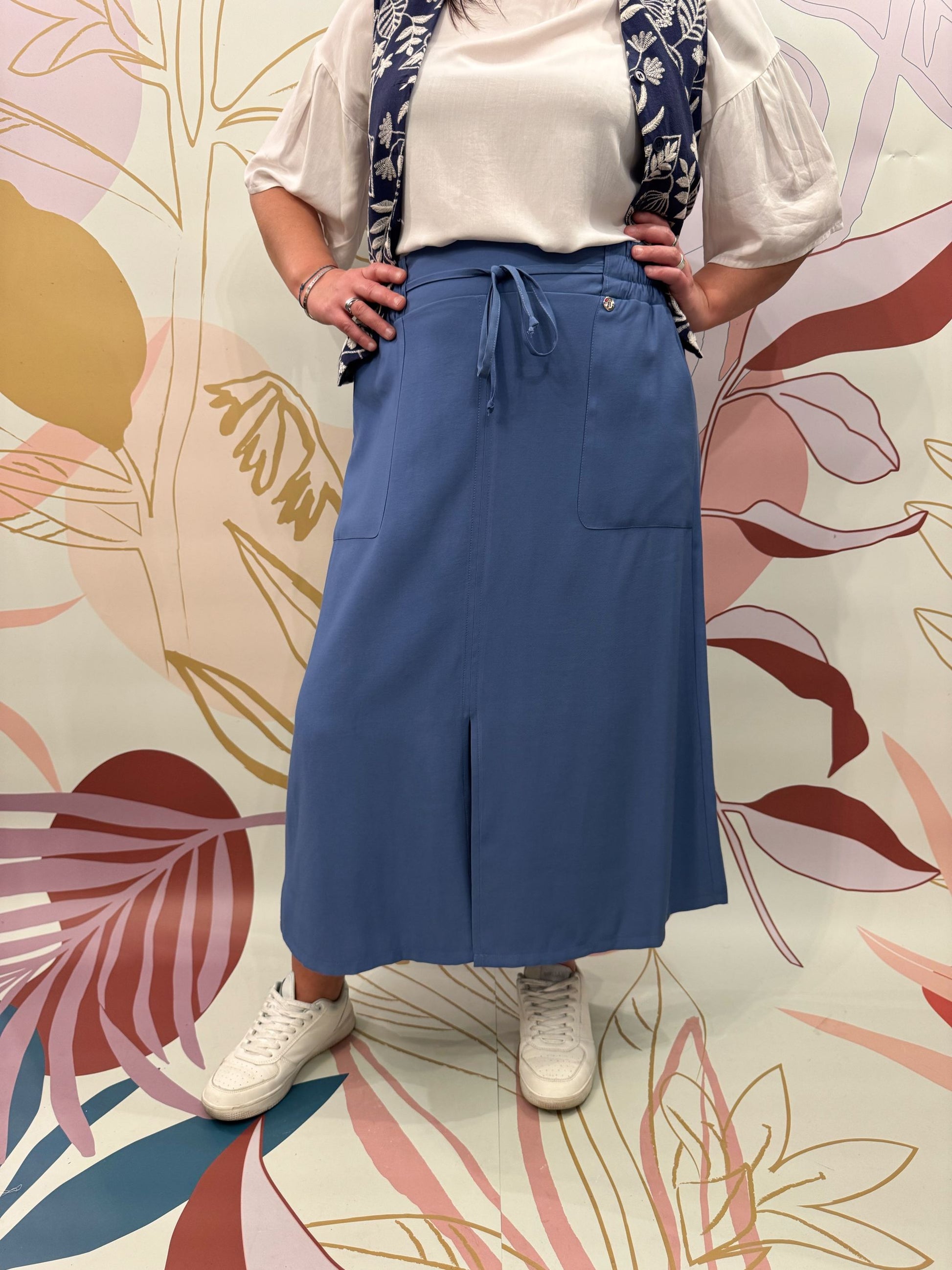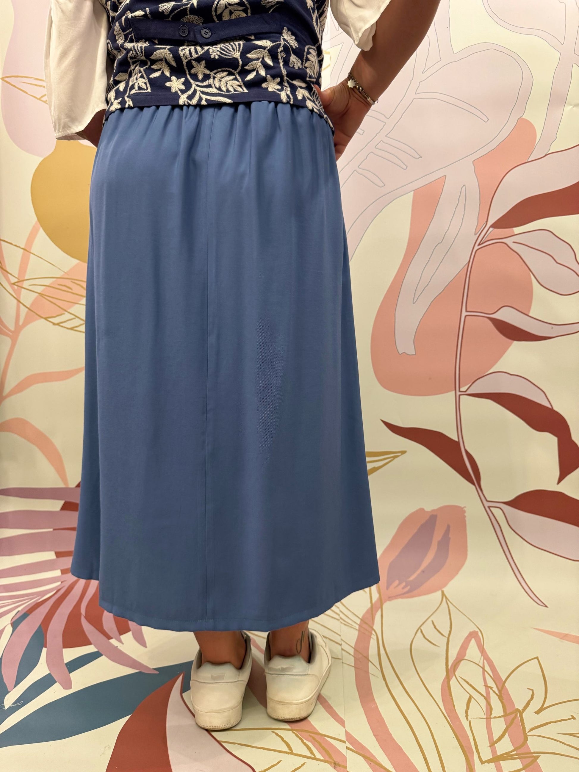 Gonna con coulisse. La modella è alta 173 cm e veste una 48. Vestibilità curvy. Composizione: 91% viscosa 9% poliestere