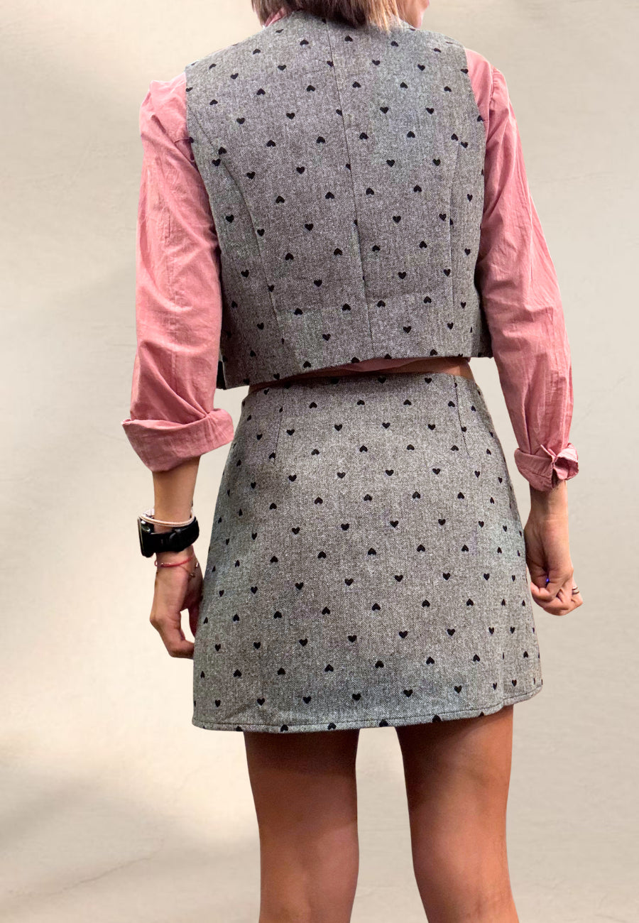 Gonna mini con taglio a trapezio con zip ma senza baschina in vita. E' foderata.