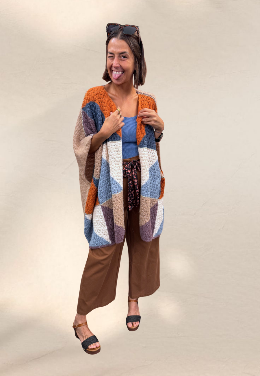 Poncho tramato a maglia super colorato. Taglia unica. Vestibilità ampia.
